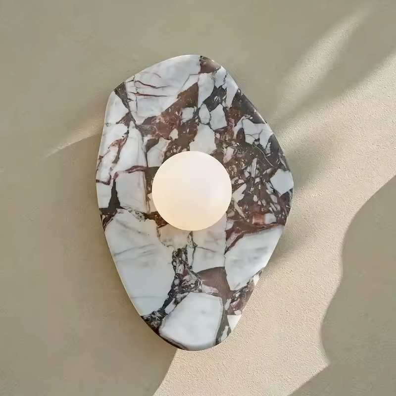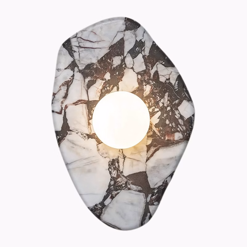 Cette applique marie une forme brute et une pierre naturelle raffinée. Chaque motif marbré est unique, évoquant un galet poli par le temps. La sphère lumineuse centrale offre un éclairage LED doux, idéal pour créer une ambiance intime.