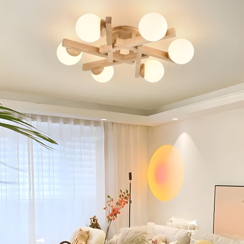 Fabriqué avec du bois massif de qualité supérieure et des globes en verre soufflé, ce lustre garantit esthétique raffinée et durabilité exceptionnelle. La combinaison bois-verre apporte authenticité et légèreté tout en assurant une diffusion lumineuse optimale et homogène dans toute la pièce. Chaque globe en verre est soigneusement fixé pour garantir sécurité et stabilité.