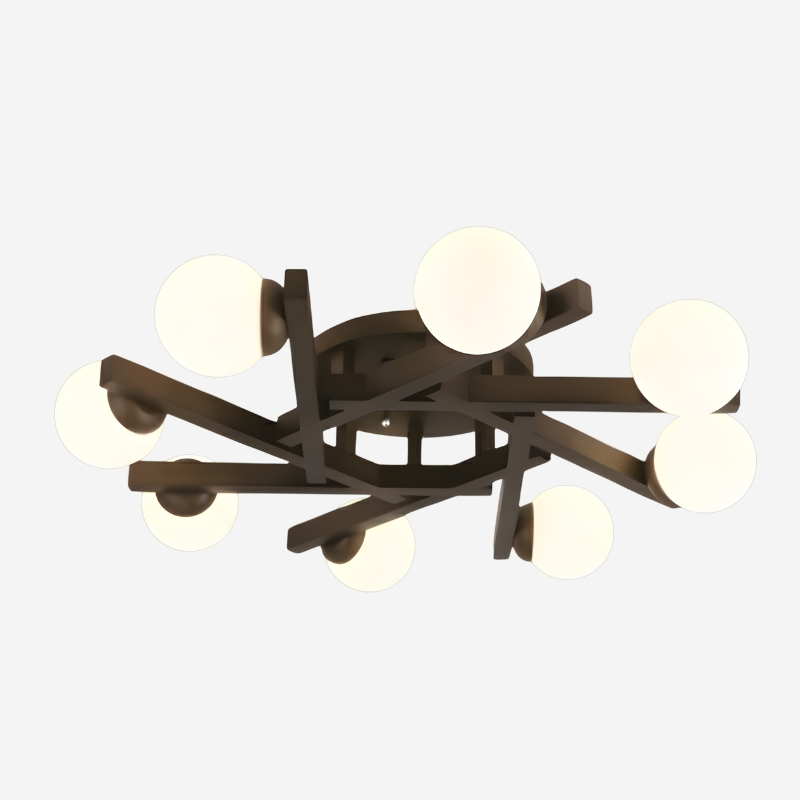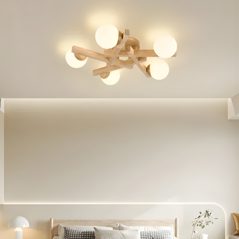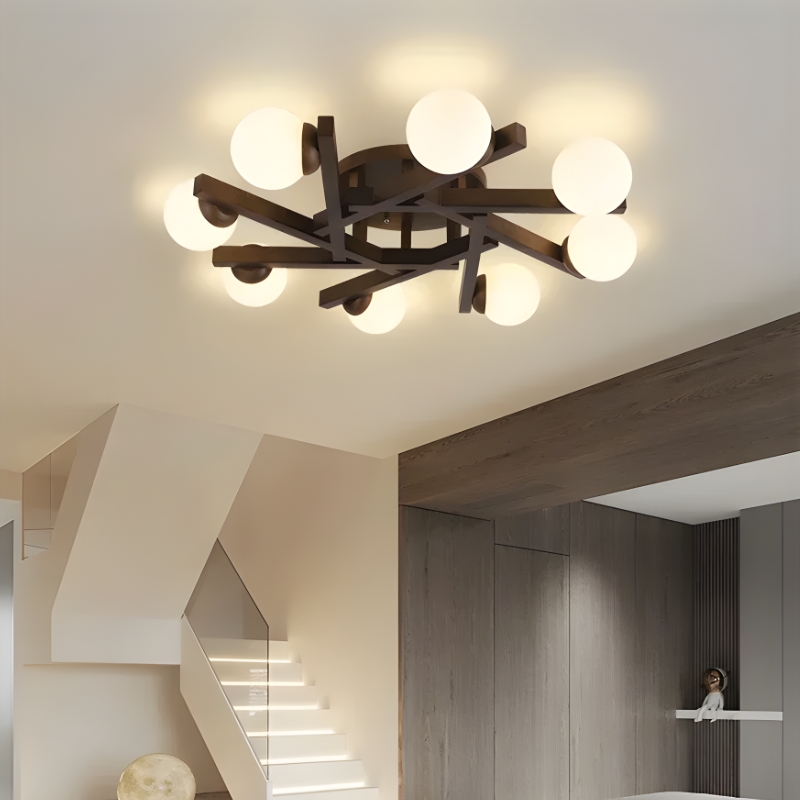 Lustre plafonnier design avec branches organiques alliant bois naturel et globes en verre. Sculpture lumineuse élégante qui crée une ambiance chaleureuse et raffinée, parfaite pour salon, chambre ou salle à manger contemporaine.