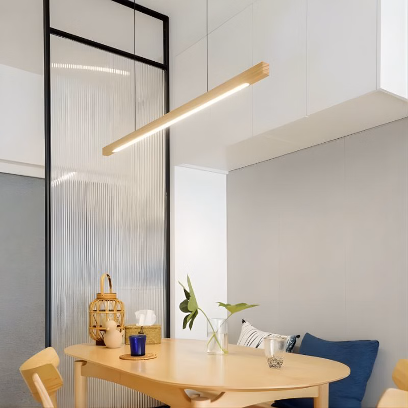 Suspension linéaire élégante en bois naturel avec LED. Design épuré et contemporain qui diffuse une lumière uniforme, parfaite pour illuminer tables à manger, îlots de cuisine ou espaces de travail avec style.